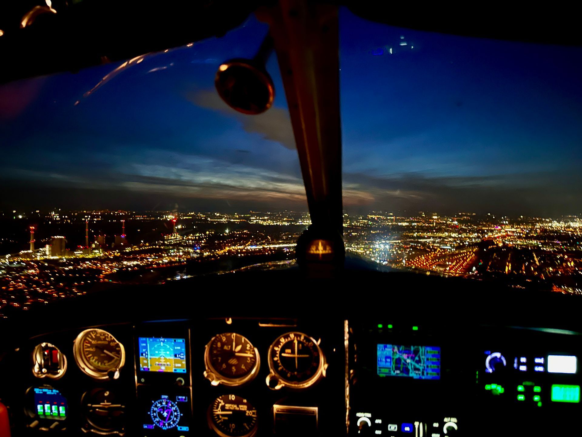 Es ist immer wieder ein atemberaubender Anblick, die Lichter beleuchteter Städte oder Beleuchtung einer Landebahn bei Nacht aus dem Cockpit zu erleben.